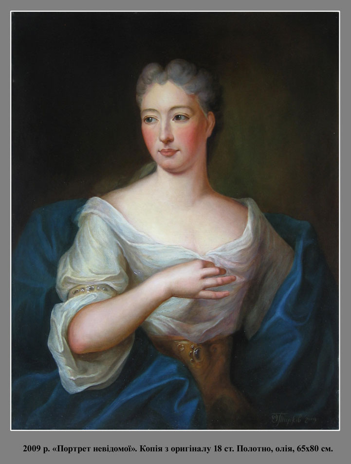 (такі як "Святий Петро" та "Портрет невідомої"). Більшість – з репродукцій творів видатних європейських майстрів 18-19 ст.
